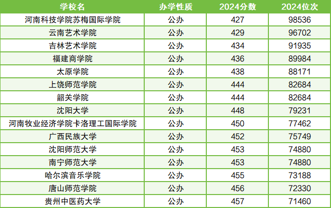 2024年文科二本压线招生的公办院校共有11所,它们的最低招生分数均为457分,对应最低位次为76813名。其中省重点院校有河北经贸大学、山西医科大学、广西师范大学。