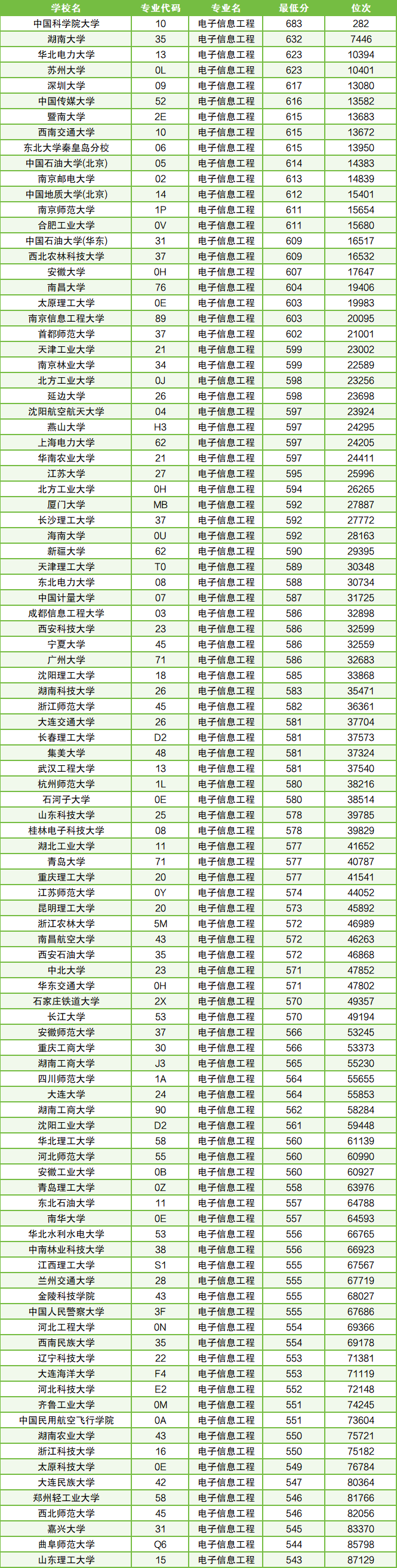 其次是湖南大学,2024年电子信息工程专业招生最低分为632分,对应最低位次为7446名。而上述两所院校也是唯二招生位次在1万名以内的大学了。