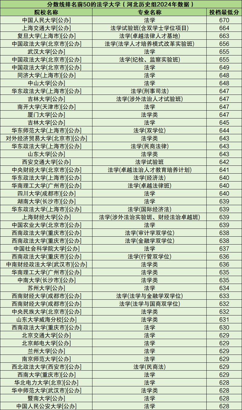 分数线排名前50强院校从中国人民大学到中国人民公安大学,录取分数线最低的有暨南大学、华中师范大学、华北电力大学和中国人民公安大学,这四所学校2024年法学最低分均为628分。