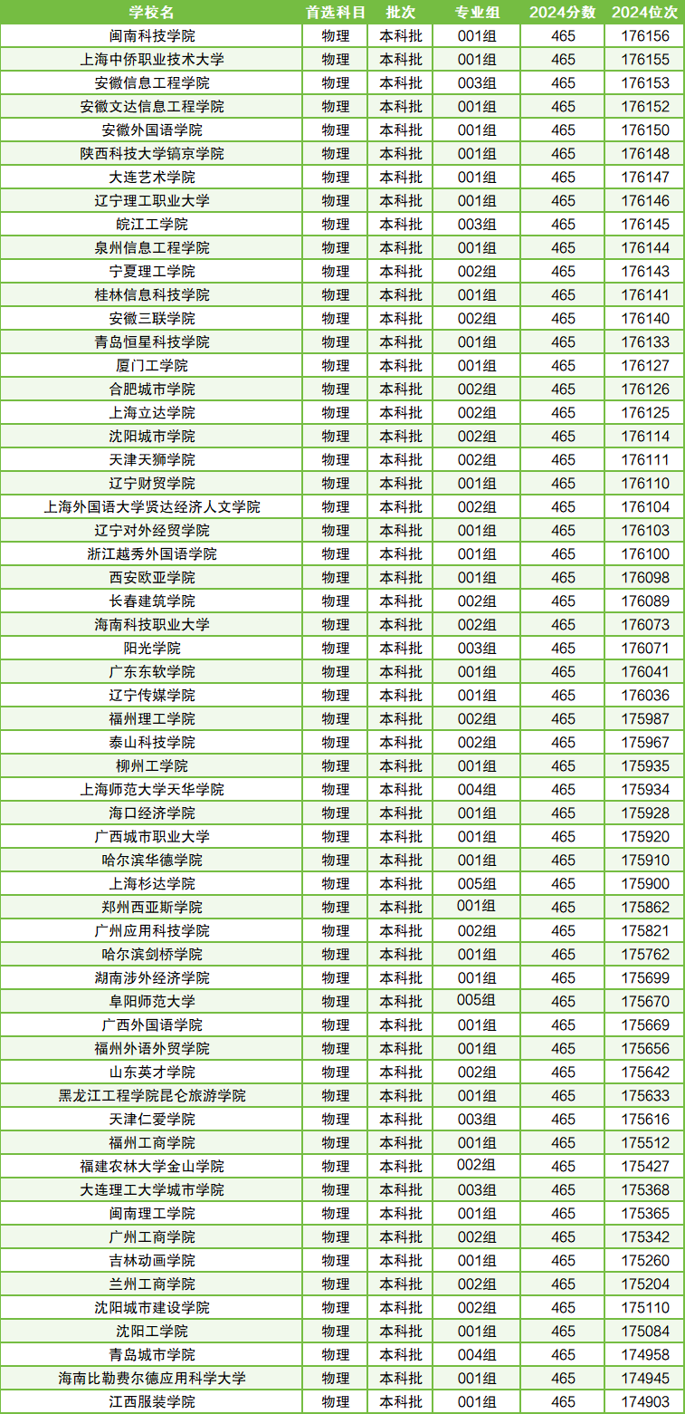 2024年最低分本科大学共有59所,它们的最低录取分数均为465分,最低录取位次范围在174903名~176156名之间。其中公办院校只有一所,即阜阳师范大学(005组,中外合作)。