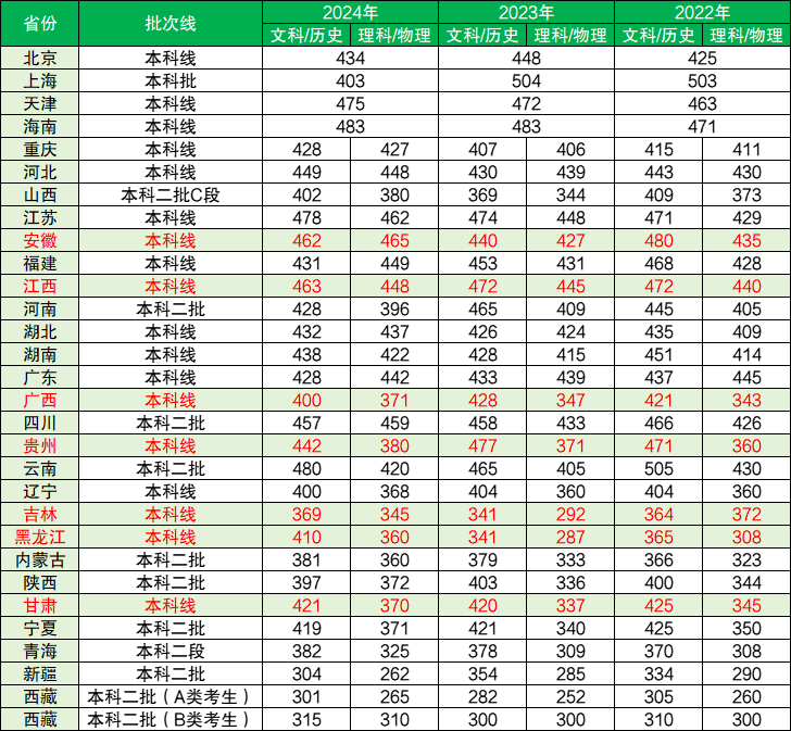 为帮助同学们了解近三年各省市区考生上本科的最低分情况,这里附上2022年-2024年全国本科线一览表,以供参考。