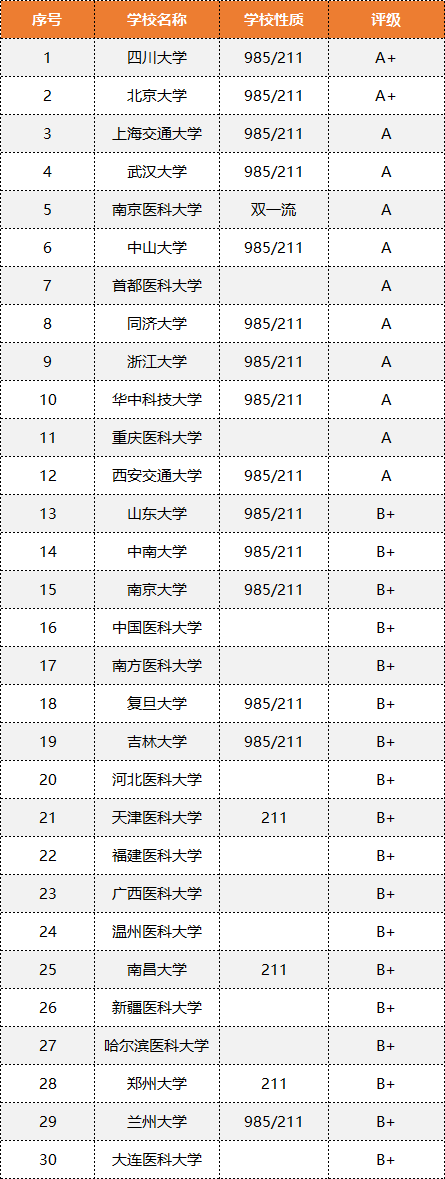 | 1 | 北京大学 | 口腔医学 | A+ |